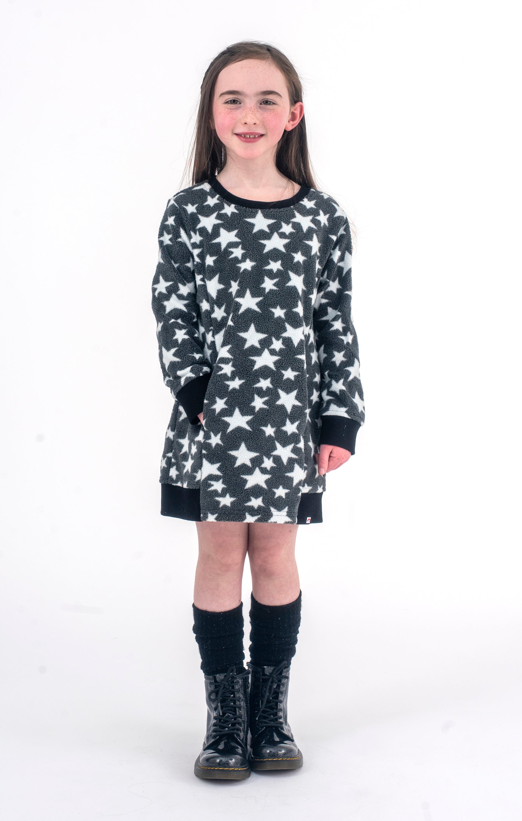 The Camila Dress in Stars is a playful and stylish black dress perfect for any little girl who wants to shine. The long-sleeved dress is adorned with white stars, giving it a celestial feel that's out of this world. It's perfect for any occasion, from birthday parties to playdates. With this dress, your little one can shoot for the stars and reach for the sky!